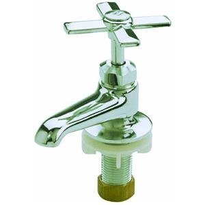 Single basin faucet. Polished chrome finish, replaceable seat stem includes both hot and cold index buttons Spout is 3" from middle of handle to tip of spout. 1/2" M.I.P.S. faucet shank. 1 per box. Import.