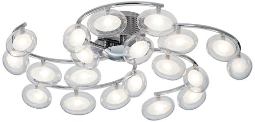 This contemporary semi-flushmount ceiling fixture glows with beautiful materials and a spectacular design. Brilliant halogen bulbs are nestled in pods of frosted glass within larger pods of clear glass. The fluid frame features a gleaming chrome finish to complete this stunning look.